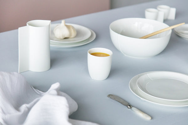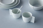 16世紀のオランダの商人たちは、日本の貴重な磁器をオランダへと持ち帰る際、将軍への特別な贈り物としてオランダのリネン生地などを献上しました。オランダ人デザイナー、クリスチャン・メンデルツマは、「磁器とリネン」という歴史上の関係性から新しい有田焼のデザインを見出しました。リネン生地を使って、コップ、皿やボウルの形状のモデルを作り、それを磁器へと再構築したデザインです。通常の釉薬を使用したものと、2016/を制作する10の窯元で廃棄する磁器材料が混ぜ込まれた釉薬を利用したものの、2つのカラー展開があります。