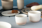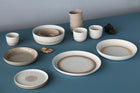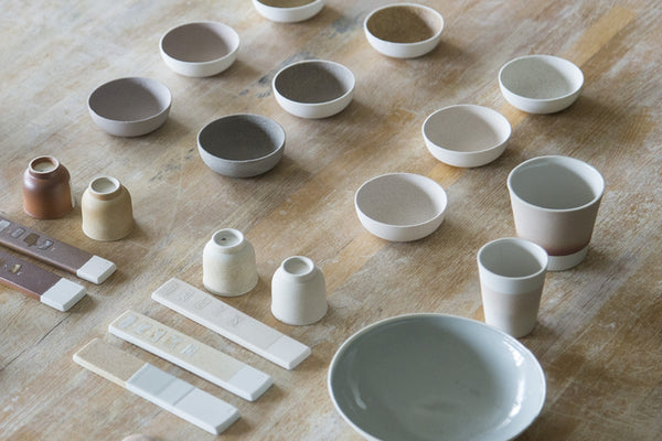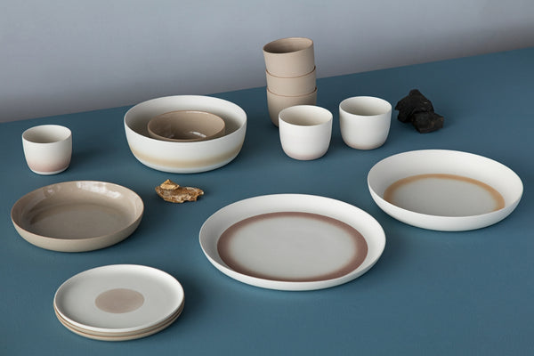 オランダのデザイナー、カースティ・ヴァン・ノートは、素材のリサーチからデザインをスタートさせました。彼女は採石場を訪れ、有田で利用される陶石が不純物を殆ど含まない極めて特別なものであることや、不純物を多く含む原料は全て廃棄されている現状を知りました。そして、普段廃棄される不純物を多く含む陶石に着目し、自然から生み出される美しい色合いの陶土を開発しました。コレクションの2つのシリーズは、独特の色彩と素材感を強調するように、シンプルな形状で構成されています。